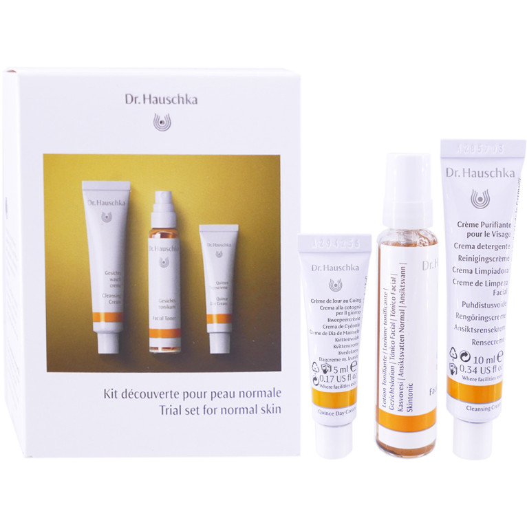 Kit Découverte pour Peaux Normale discount de Dr HAUSCHKA, la cosmétique bio et naturelle dans votre parapharmacie en ligne à prix discount, pour un rituel rafraîchissant en 3 étapes au quotidien destiné aux peaux normales : Crème Purifiante (10ml), Lotion Tonifiante (10ml), Crème de Jour au Coing (5ml). Visage
