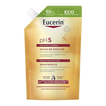 L’Huile de Douche pH5 nettoie, hydrate intensément la peau et renforce le film protecteur de la peau pour mieux lutter contre les agressions extérieures et ainsi lutter contre la sensibilité et la sècheresse, et protège les enzymes cutanées grâce à ses tensioactifs extra-doux et au tampon citrate pH5. Un complexe relipidant permet de lutter contre le dessèchement et laisse la peau soyeuse après la toilette. Après la douche, la peau retrouve une grande douceur, sa souplesse et est apaisée. L’écorecharge contient 65 % de poids d’emballage en moins par rapport au flacon-pompe 400 ml ; ce qui permet de réduire les déchets.