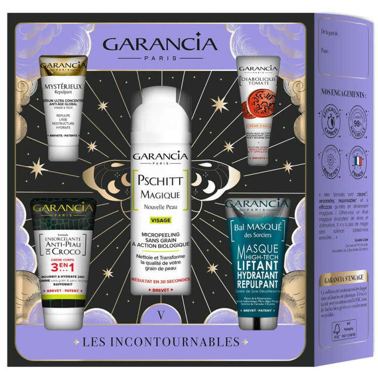 Ce coffret de la marque Garancia propose une expérience sensorielle unique avec des textures innovantes et des formules enrichies en actifs cosmétiques performants. Le Pschitt Magique Nouvelle Peau (30 ml) est une micropeeling sans grain qui nettoie en douceur grâce à son action enzymatique, tandis que le Mystérieux Repulpant (5 ml) est un sérum qui contribue à lisser l'apparence des rides. La Diabolique Tomate Crème d'Eau (6 ml) offre une hydratation optimale avec sa texture gel-crème légère. Le Bal Masqué des Sorciers Masque High-Tech Liftant Hydratant Repulpant (10 ml) procure un effet tenseur immédiat pour une peau d'apparence plus ferme, et l'Ensorcelante Formule Anti-Peau de Croco 3en1 (15 ml) adoucit et nourrit intensément pour une peau soyeuse.