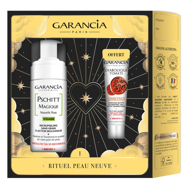 Ce coffret est proposé par la marque Garancia, reconnue pour ses formules innovantes et sensorielles. Le coffret inclut le Pschitt Magique visage 100 ml, une mousse nettoyante et exfoliante délicate qui purifie la peau grâce à son action micro-peeling sans grain, et la Crème d'eau Diabolique Tomate 20 g, une crème hydratante à la texture légère qui contribue à maintenir l'hydratation de la peau. Le Pschitt Magique utilise des actifs comme une enzyme brevetée à action biologique et des extraits botaniques pour son effet micropeeling sans grain qui nettoie en douceur. La Crème d'eau Diabolique Tomate contient des actifs végétaux pour leur pouvoir antioxydant et hydratant.