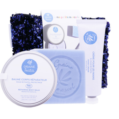La trousse Paillettes contient un baume corps réparateur, une crème pour les mains et un savon cube, tous conçus pour nourrir et protéger votre peau.