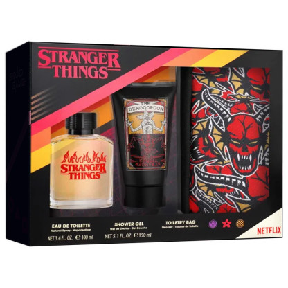 En vente en ligne sur le site de votre parapharmacie à prix discount, découvrez le coffret Stranger Things de Netflix, comprenant un parfum de 100 ml aux notes aromatiques et fougères, un gel douche de 100 ml et une trousse de toilette Hellfire Club.