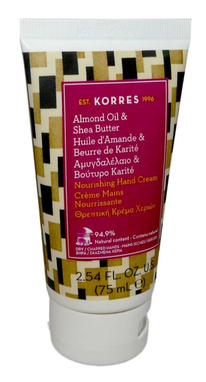 Crème mains nourrissante de KORRES, la crème au beurre de karité et à l’amande qui soulage les mains abîmées et sèches.