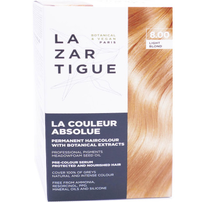 COULEUR ABSOLUE discount de LAZARTIGUE, la puissance végétale dans votre parapharmacie en ligne à prix discount, dans une coloration à la formule vegan pour assurer couleur intense, brillance et protection longue durée. Couleur Blond Clair 8.00
