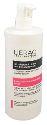 LIERAC est la première marque française dermo-cosmétique spécialisée dans la correction du vieillissement et des désordres cutanés, et instauratrice de la « cosmétique technique » qui allie plaisir des sens et efficacité. La gamme LIERAC PRESCRIPTION corps est constituée de soins experts développés avec la technologie SKRL3 brevetée LIERAC réequilibrante, protectrice et hydratante, pour hydrater en profondeur et réconforter les peaux sèches et sensibles. Le lait relipidant corps anti-dessèchement de LIERAC PRECRIPTION, à la texture fondante, est spécialement conçu pour apporter une hydratation longue-durée, apaiser et rétablir le confort des peaux sèches et sensibles. Sa formule est composée d’huile de carthame hydratante, relipidante, nourrissante, adoucissante et protectrice, d’urée dosée à 14% : constituant du film hydro-lipidique qui entre dans la composition des facteurs d’hydratation naturels, et de beurre de karité réparateur, nourrissant et assouplissant. Formule haute tolérance hypoallergénique, sans paraben, sans colorant, parfum sans allergène.