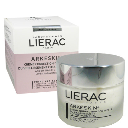 LIERAC est la première marque française dermo-cosmétique spécialisée dans la correction du vieillissement et des désordres cutanés, et instauratrice de la « cosmétique technique » qui allie plaisir des sens et efficacité. La gamme ARKESKIN+ est constituée de produits inspirés des recherches en endocrinologie qui vise à corriger les effets du vieillissement et le dessèchement de la peau pendant la période de la ménopause. La crème ARKESKIN+ Ciblé Ménopause est un soin anti-âge ciblé qui va par son concentré substitutif Hormone Like (cytonacre SP : poudre de nacre micronisée brevetée) qui ne contient pas de phyto-œstrogène, ainsi qu’aux extraits de sésame et chataigne, régénérer les 3 grandes cellules fondamentales de la peau (Kératinocytes, fibroblastes, mélanocytes) afin de permettre à la peau de lutter contre les signes de l’âge lié à la ménopause et la perte en eau cutanée tout en hydratant intensément. Dès l’application la peau est réconfortée pour retrouver de la douceur et un teint unifié. Jour après jour, la peau retrouve toute sa beauté, les signes de l’âge sont estompés.