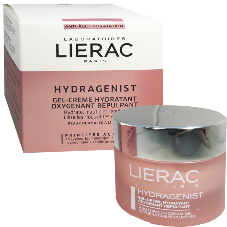 LIERAC est la première marque française dermo-cosmétique spécialisée dans la correction du vieillissement et des désordres cutanés, et instauratrice de la « cosmétique technique » qui allie plaisir des sens et efficacité. La gamme HYDRAGENIST est constituée de produits inspirés de la technique esthétique d’oxygénation cellulaire qui vise à pulvériser de l’oxygène, de l’acide hyaluronique et des vitamines dans l’épiderme pour repulper la peau, rétablir sa fraicheur et illuminer son teint. Le gel-crème HYDRAGENIST de LIERAC, à la texture fraîche et délicatement parfumée, est spécialement conçu pour désaltérer les peaux normales à mixtes. Sa formule innovante, associe le complexe Hydra O2 composé d’oxygène biomimétique, d’acide hyaluronique, de feuille de vernonia, de vitamines et minéraux, à des NMF dosés à 5%, des micros poudres de riz et des agents matifiants soft focus pour hydrater l’épiderme, repulper intensément la peau, réduire les rides et ridules, illuminer le teint sans effet de brillance et offrir une nouvelle jeunesse au visage. Testé sous contrôle dermatologique. Non comédogène. Sans paraben