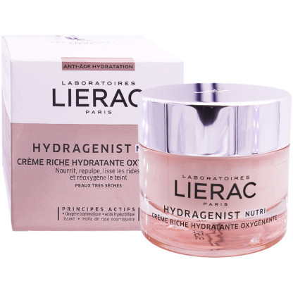 LIERAC est la première marque française dermo-cosmétique spécialisée dans la correction du vieillissement et des désordres cutanés, et instauratrice de la « cosmétique technique » qui allie plaisir des sens et efficacité. La gamme HYDRAGENIST est constituée de produits inspirés de la technique esthétique d’oxygénation tissulaire qui vise à pulvériser de l’oxygène, de l’acide hyaluronique et des vitamines dans l’épiderme pour repulper la peau, rétablir sa fraîcheur et illuminer son teint. A la texture « beurre » fraîche et fondante délicatement parfumée, le Nutri Crème Riche est spécialement conçu pour hydrater intensément les peaux très sèches assoiffées et les réconforter. Sa formule innovante, associe l'oxygène biomimétique, l'acide hyaluronique, l'extrait de rose sauvage du chili et les vitamines C,E, B5 et B6, pour hydrater intensément l’épiderme, protéger et repulper la peau, lisser les rides et ridules, tonifier la peau et la nourrir, et offrir de la douceur, fraîcheur et une nouvelle jeunesse au visage. Son parfum frais et délicat laissera des notes d’eau de rose, jasmin et gardénia.