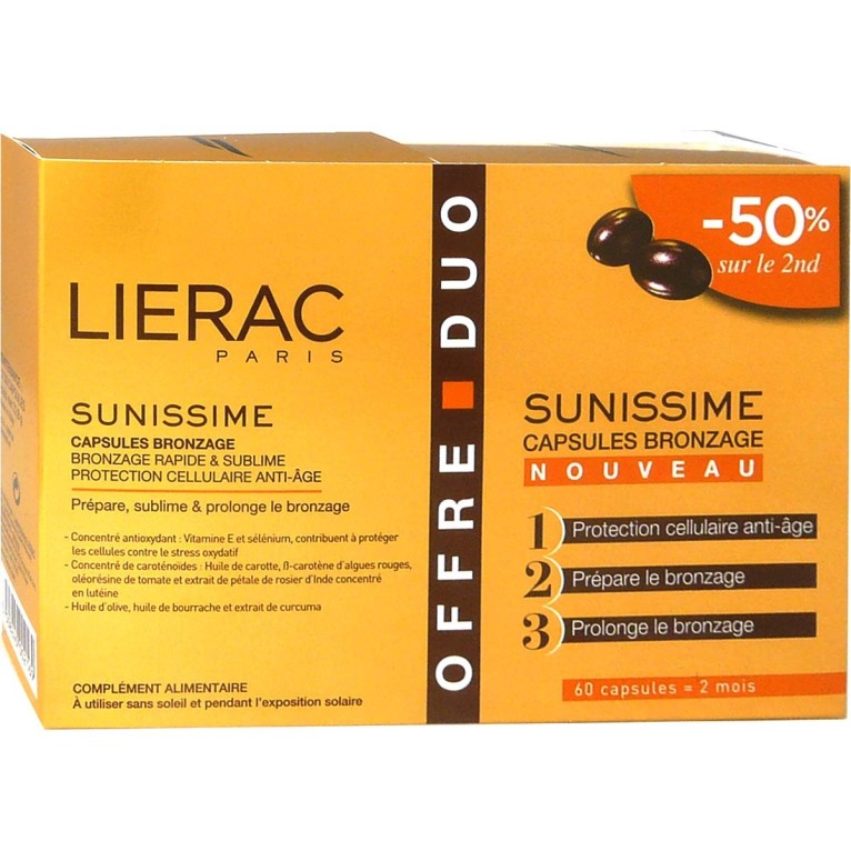 SUNISSIME Capsules bronzage de LIERAC discount, un complément alimentaire conçu pour préparer la peau à l’exposition solaire dans votre parapharmacie en ligne à prix discount, et sublimer le bronzage.
