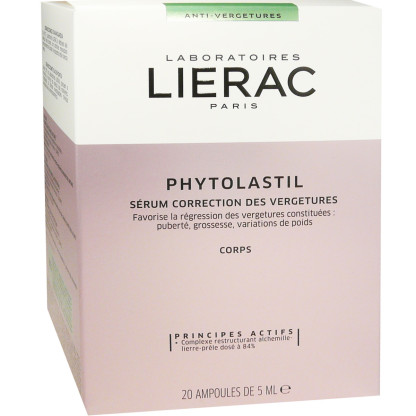 LIERAC est la première marque française dermo-cosmétique spécialisée dans la correction du vieillissement et des désordres cutanés, et instauratrice de la « cosmétique technique » qui allie plaisir des sens et efficacité. La gamme PHYTOLASTIL est constituée de soins ciblés, développés pour lutter contre la dégradation des fibres d’élastine et de collagène, responsable de l’apparition des vergetures. PHYTOLASTIL AMPOULES, sérum correction des vergetures constituées de LIERAC, à la texture non grasse, est spécialement conçu pour restructurer l’épiderme et favoriser la régression des vergetures constituées (profondeur, largeur, longueur, couleur). Sa formule est composée d’une association spécifique d’actifs restructurants : alchemille-lierre-prêle riches en flavonoïdes et tanoïdes, capables de relancer la synthèse des fibres de collagène et d’élastine. Résultats positifs dans 80% des cas.