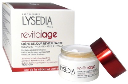 La gamme REVITALAGE des laboratoires LYSEDIA est composée de soins anti-âges destinés aux peaux fatiguées, en manque de tonus et d’éclat pour les régénérer, les hydrater et leur redonner leur éclat naturel. La Crème de jour revitalisante Revitalage va redessiner l’ovale du visage, régénérer le collagène, l’élastine et les cellules de la peau en les renouvelants, renforcer et redonner vitalité à la peau, diminuer les rides et ridules, et nourrir intensément grâce à sa richesse en acide hyaluronique, micronutriments naturels, à des extraits de ginseng rouge et d’algue spiruline (riche en nutriments : acides aminés, vitamines et oligo-éléments). Jour après jour, le visage est lumineux et retrouve son éclat, la peau retrouve souplesse et élasticité.