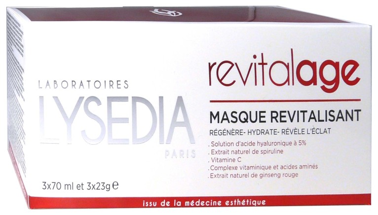 La gamme REVITALAGE des laboratoires LYSEDIA est composée de soins anti-âges destinés aux peaux fatiguées, en manque de tonus et d’éclat pour les régénérer, les hydrater et leur redonner leur éclat naturel. Le Masque revitalisant Revitalage est un soin nouvelle génération soft mésolift qui va agir comme un acte esthétique sans les inconvénients des aiguilles et des douleurs ! Elle va régénérer et stimuler le collagène, l’élastine et les cellules de la peau en les renouvelants, participer au renouvellement des fibroblastes, et hydrater intensément et en profondeur grâce à sa richesse en acide hyaluronique, à des extraits de ginseng rouge (plante adaptogène) et d’algue spiruline (riche en nutriments : acides aminés, vitamines et oligo-éléments), ainsi que de vitamine C et d’un complexe vitaminique et d’acides aminés. Jour après jour, le visage est lumineux et retrouve son éclat, la peau retrouve souplesse et élasticité.