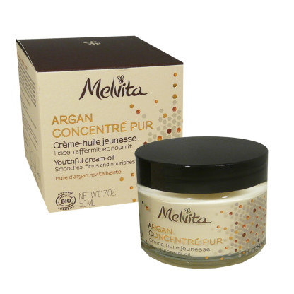 MELVITA, marque pionnière de la cosmétique BIO, est née de la passion d’hommes pour le miel, cette merveilleuse substance située entre le mode animal et végétal. Depuis près de 40 ans, MELVITA développe des produits dermo-cosmétiques en allégeant au maximum son impact sur la planète et en protégeant la nature et les abeilles. MELVITA offre la garantie de produits composés d’ingrédients naturels et biologiques, exempts de matières pétrochimiques peu biodégradables, pour toujours offrir le meilleur et le plus beau de la nature. La gamme Argan Concentré Pur de MELVITA propose des soins formulés à base d’une huile miraculeuse et authentique hautement concentrée : l’huile d’argan riche en acides gras essentiels, secret ancestral de beauté orientale aux formidables pouvoirs nourrissants, raffermissants et protecteurs. La Crème-Huile Jeunesse ARGAN CONCENTRE PUR de MELVITA, à la texture crème en huile brevetée non grasse et au parfum délicatement fleuri, à base d’huile d’argan dont les gouttes ont été encapsulées pour un pouvoir raffermissant optimal, est un soin spécialement conçu pour lutter contre le vieillissement cutané, lisser, protéger et rétablir le confort de la peau en nourrissant intensément. Jour après jour, les contours du visage sont redessinées, la peau est lisse et gagne en fermeté. Non comédogène. Testée sous contrôle dermatologique