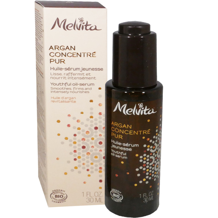 MELVITA, marque pionnière de la cosmétique BIO, est née de la passion d’hommes pour le miel, cette merveilleuse substance située entre le mode animal et végétal. Depuis près de 40 ans, MELVITA développe des produits dermo-cosmétiques en allégeant au maximum son impact sur la planète et en protégeant la nature et les abeilles. MELVITA offre la garantie de produits composés d’ingrédients naturels et biologiques, exempts de matières pétrochimiques peu biodégradables, pour toujours offrir le meilleur et le plus beau de la nature. La gamme Argan Concentré Pur de MELVITA propose des soins formulés à base d’une huile miraculeuse et authentique hautement concentrée : l’huile d’argan riche en acides gras essentiels, secret ancestral de beauté orientale aux formidables pouvoirs nourrissants, raffermissants et protecteurs. L’Huile-Sérum Jeunesse ARGAN CONCENTRE PUR de MELVITA, à la texture huile sèche non grasse vite absorbée et au parfum délicatement fleuri, à base d’huile d’argan dont les gouttes ont été encapsulées pour un pouvoir raffermissant optimal associé à un acide aminé anti-âge, est un soin spécialement conçu pour lutter contre le vieillissement cutané, lisser, protéger et rétablir le confort de la peau en nourrissant intensément. Jour après jour, les contours du visage sont redessinées, la peau est lisse et gagne en fermeté et en jeunesse. Non comédogène. Testée sous contrôle dermatologique