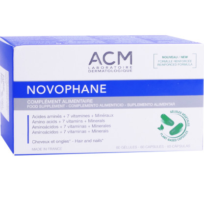 ACM NOVOPHANE Cheveux et Ongles du laboratoire ACM à prix discount, un complément alimentaire conçu à partir d’acides aminés, de vitamines et de minéraux, en vente dans votre parapharmacie en ligne discount.