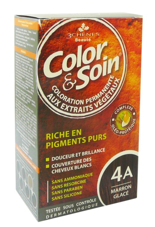 Color & Soins coloration permanente aux extraits végétaux des laboratoires 3 Chênes, efficacité, naturalité et innovation dans une coloration qui offre soin et reflets intenses aux cheveux, protection et douceur aux cuirs chevelus les plus sensibles. 4A Marron Glacé.