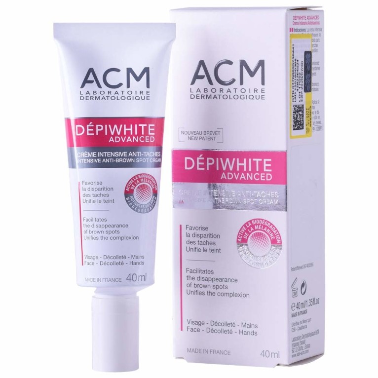 La gamme Dépiwhite du laboratoire ACM est composée de produits dermatologiques destinés à réduire les taches cutanées sur la peau. La Crème Dépigmentante Advanced Dépiwhite pénètre rapidement pour une action plus rapide et plus en profondeur. Elle estompe les taches pigmentaires et lutte contre leur réapparition grâce à l'acide kojique, à la vitamine C, aux esters d'AHA ainsi qu'à un nouvel actif l'antipollon. La peau est plus claire et le teint est unifié