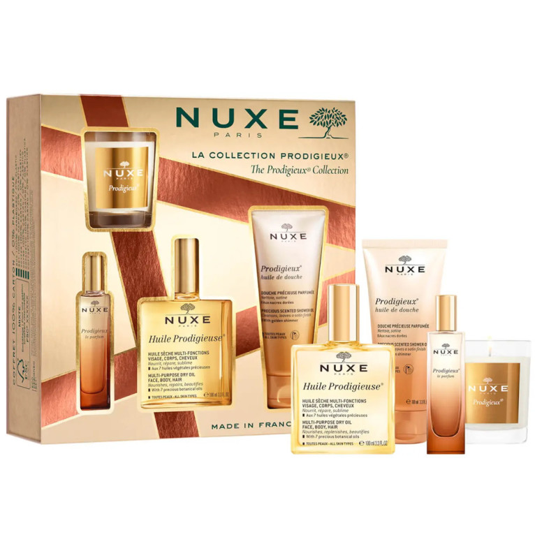 Le Coffret « La Collection prodigieux » discount de NUXE, 4 produits à offrir ou à se faire offrir, pour des fragrances mythiques du parfum NUXE ! Huile Prodigieuse (100ml) ; Le Parfum Prodigieux (15ml) ; Huile de douche (100ml), Bougie d’intérieur Prodigieuse (70g) dans votre parapharmacie en ligne à prix discount