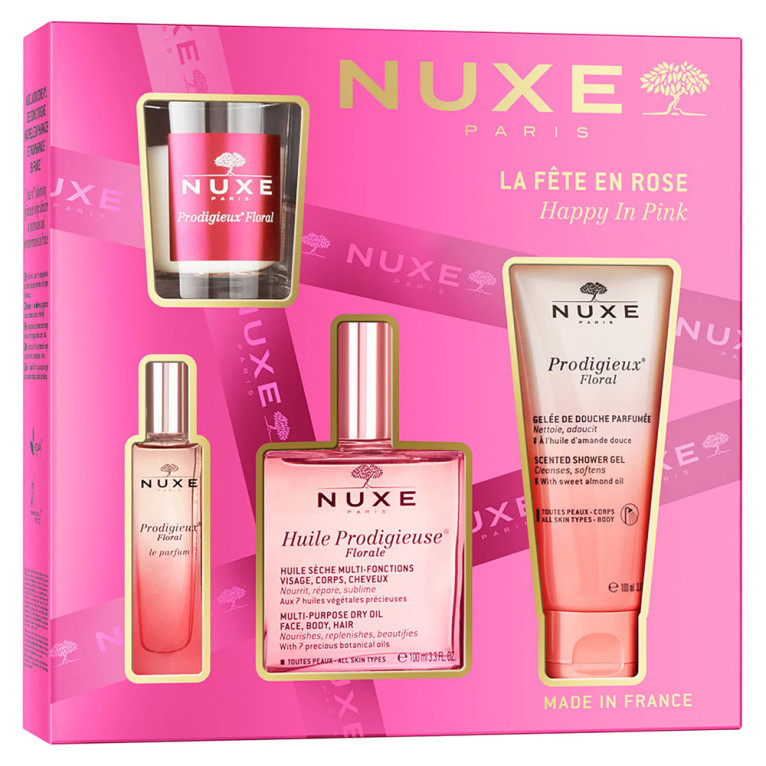 Ce coffret de la marque NUXE comprend trois produits aux textures délicates, conçus pour nettoyer et apaiser la peau tout en laissant un parfum floral agréable. Le Gelée de Douche Parfumée Prodigieux® Florale nettoie en douceur grâce à sa mousse légère et parfumée. Le Prodigieux® Floral, une huile sèche, nourrit et adoucit la peau sans laisser de film gras. Enfin, la Bougie d'intérieur Prodigieux® Florale crée une ambiance relaxante avec son parfum envoûtant. Les ingrédients actifs incluent l'Huile Prodigieuse® Florale qui adoucit la peau et le parfum Prodigieux® Floral qui apporte une note florale délicate.