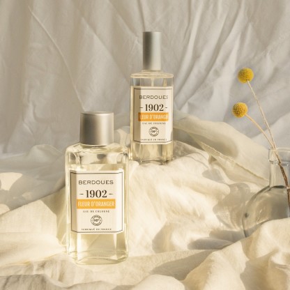 L'eau de Cologne Fleur d'Oranger, une eau de Cologne subtilement régressive grâce à un cocktail d’agrumes dominé par la douceur du néroli et du petit grain. Le cœur s’épanouit sur un bouquet floral sublimé par la fleur d’oranger qui révèle un sillage confortable et rassurant de musc blanc