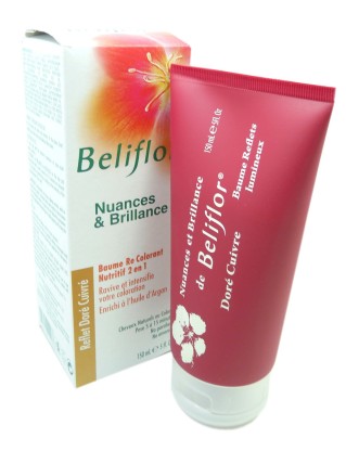 Le laboratoire BELIFLOR conçoit des produits capillaires (coloration, soins, brossage) pour donner de la beauté aux cheveux. Le baume qui s’applique après le shampooing et s’utilise entre 2 colorations, répare et protège les cheveux des agressions extérieures, nourrit, et intensifie la couleur pour redonner de la beauté et de la lumière à la chevelure grâce à sa richesse en huile d’argan, à l’héliogénol végétal, à l’extrait de tournesol ainsi qu’aux filtres UV. Il ne faut que 5 à 15 minutes pour retrouver des reflets intenses. Sa texture crémeuse en fait un agréable soin, facilite le démêlage et parfume délicatement les cheveux. Le baume Nuances et Brillances ne s’utilise pas seul sur les racines blanches et couvre seulement les premiers cheveux blancs (pas plus de 30% de la chevelure).