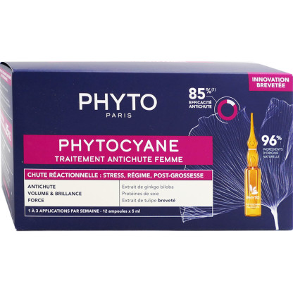 Développé par le laboratoire Phyto, ce produit est reconnu pour son efficacité et sa qualité. Il agit sur les chutes de cheveux dite réactionnelle fait suite à un régime, du stress, de la fatigue, un accouchement ou allaitement, ou les changements de saisons. Le traitement antichute réactionnel PHYTOCYANE est formulé à base d'un extrait de gingko biloba qui vivifie le follicule pileux affaibli et favorise la microcirculation du cuir chevelu, essentielle à la croissance d'un cheveu fort, de protéines de soie qui apportent brillance aux cheveux ternes et fatigués et d'un extrait de tulipe qui renforce la structure du cheveu, pour apporter force et résistance. Grâce à sa formule unique, ce traitement agit en profondeur pour ralentir la chute des cheveux et favoriser leur repousse. Les cheveux retrouvent ainsi force, densité et vitalité. Facile à utiliser, PHYTOCYANE se présente sous forme de 12 fioles à appliquer directement sur le cuir chevelu. Il suffit de répartir le contenu d'une fiole sur l'ensemble du cuir chevelu, puis de masser délicatement pour favoriser la pénétration des actifs. Ce traitement est adapté à tous les types de cheveux des femmes et peut être utilisé en complément d'autres produits capillaires.