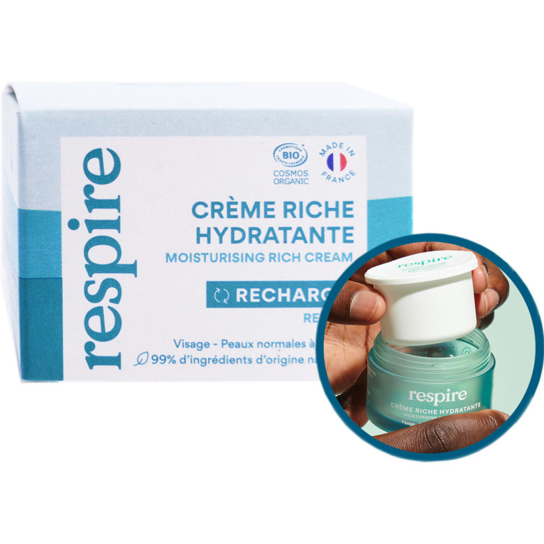 Recharge Crème Riche Hydratante Bio discount de Respire, un soin hydratant à 99% d'origine naturelle indiqué pour les peaux normales à sèches, dans votre parapharmacie en ligne à prix discount.