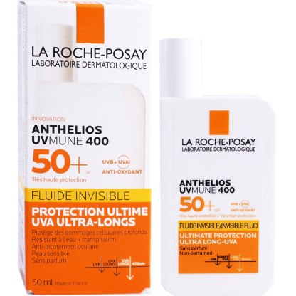 Anthelios UVMUNE 400 Fluide Sans parfum est un fluide très haute protection (SPF 50+) qui contribue à la protection des rayons UVA/UVB ultra-longs et courts à large spectre grâce à son système filtrant et aide à prévenir le stress oxydatif pouvant être causé par les UV ou la pollution. Innovant par son nouveau filtre UV Mexoryl 400, le fluide lutte contre les UVA ultra-longs qui représentent 30% des rayons UV dont la peau est exposée toute l’année. Grâce à la technologie Netlock, ce fluide agit sur la protection des UVB/UVA/UVA ultra-longs. L’eau thermale de La Roche-Posay calme les rougeurs et hydrate la peau. Adaptée aux yeux sensibles et porteurs de lentilles de contact, le fluide Anthélios bénéficie de l’innovation anti-picotements. Sa texture fluide ultra-légère facile à appliquer pénètre rapidement à l’application pour un fini non gras et invisible. Il résiste très bien à l’eau, à la transpiration et au sable. Testé sous contrôle dermatologique sur peaux sensibles et réactives, et ophtalmologique sur yeux et contour des yeux sensibles