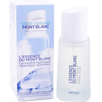 Le laboratoire SAINT-GERVAIS développe des produits dermo-cosmétiques élaborés avec de l’eau thermale de SAINT-GERVAIS Mont Blanc du massif alpin riche en minéraux aux propriétés réparatrices apaisantes, et cicatrisantes, pour répondre à tous les besoins des peaux même les plus fragiles. L’Essence du Mont-Blanc riche en acide hyaluronique, plantes alpines bio des Alpes (issu du commerce équitable), et d’eau thermale pure Mont Blanc (86%) hydrate instantanément et en profondeur pour lutter contre les signes de déshydratation (ridules, tiraillements, teint terne) pendant 24 heures, régénère les cellules cutanées et accélère leur renouvellement, repulpe, lisse et apaise la peau sensible. Sa texture gel transparent pénètre rapidement à l’application pour un fini doux et non gras. Après le soin les rides sont lissées, la peau est lisse, rebondie, et fraîche, prête à recevoir le soin de jour. Testé sous contrôle dermatologique, hypoallergénique, Sans : paraben, phénoxyéthanol, silicones, huiles minérales, ni parfum. Fabriqué en France