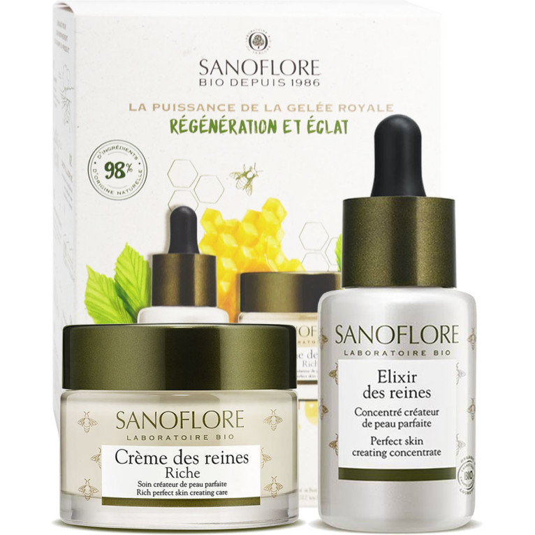 Coffret Régénération & Eclat discount de SANOFLORE, toute la richesse du végétal dans un concentré créateur de peau parfaite, dans votre parapharmacie en ligne à prix discount. Elixir des reines 30ml + Crème des reines riche 50ml.