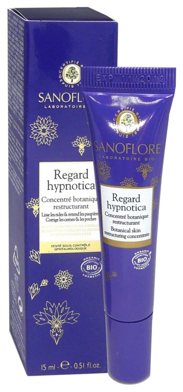SANOFLORE extrait toutes les richesses du végétal et les incorpore dans une gamme de soins de beauté élaborés à base d’eaux florales et d’huiles essentielles, pour offrir le meilleur de la nature aux peaux les plus sensibles. Les soins de la gamme Hypnotica sont élaborés à base d’hydrolat de Bleuet Centaurea Bio du Vercors et d’extrait d’abre à soie Bio, deux actifs naturels aux pouvoirs anti-fatigue, anti-âge et protecteurs incomparables. Le Regard Hypnotica va redonner aux yeux leur luminosité grâce à la cire de sarrasin, l’adénosine, l’acide hyaluronique, la caféine et l’arginine aux propriétés décongestionnantes, fortifiantes, et hydratantes. Instantanément, le contour des yeux est hydraté, les signes de fatigue et de l’âge sont estompés. Jour après jour, le regard retrouve son éclat, le contour des yeux est raffermit et restructuré, rides et ridules sont lissées et les signes de fatigue atténués. Sa texture légère et onctueuse, riche en cire de sarrasin fond sur la peau pour laisser douceur et confort. Sans paraben, sans parfum de synthèse, sans huile minérale. Testé sous contrôle dermatologique et ophtalmologique