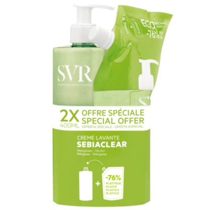 SVR SEBIACLEAR CREME LAVANTE FLACON + RECHARGE 2X400ML est en vente en ligne sur le site de votre parapharmacie à prix discount, idéale pour nettoyer en douceur les peaux grasses qui sont déshydratées ou fragilisées par des traitements. Visage et corps.