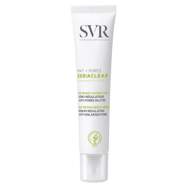 Sébiaclear Mat + Pores de SVR est à base de Gluconolactone, d’acide salicylique, du complexe Mat SR, de Niacinamide, et de sucres hydrophiles. Ce soin va lisser le grain de peau par son action douce exfoliante, lutter contre la multiplication des bactéries, libérer les pores obstrués en régulant la production du sébum, estomper et apaiser les rougeurs et hydrater intensément et pour longtemps la peau. Sa texture fluide oil-free laissera la peau douce comme du velours. Dès l’application, la peau retrouve son confort, le visage est éclatant, le teint unifié avec un fini mat et velouté. T esté sur peaux sensibles à tendance acnéique. Hypoallergénique. Sans alcool, sans colorant, paraben, sans allergène. Non comédogène