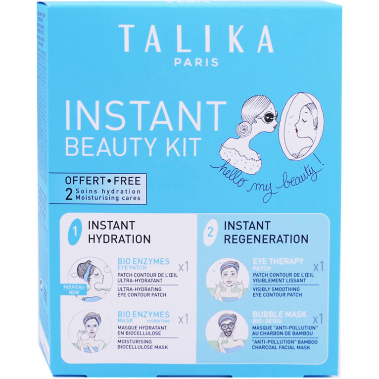 INSTANT BEAUTY KIT discount, l’innovation TALIKA dans votre parapharmacie en ligne à prix discount, dans 2 patchs et 2 masques pour préparer la peau et lui redonner son éclat, et retrouver fraîcheur et beauté n’importe où ! Bio-Enzymes Mask Masque Hydratant (20g) ; Eye Therapy Patch (1 paire) ; Bublle Mask Bio-Detox (25g) ; Eye Patch Ultra-hydratant (1 paire). Visage, et yeux