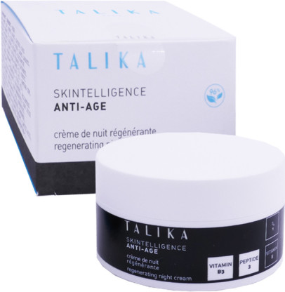 La Gamme SKINTELLIGENCE de TALIKA est basée sur l’action du microbiome de l’épiderme appelé aussi « troisième cerveau » et de son équilibre, pour une peau protégée des agressions extérieures et préservée de son éclat au quotidien. La technologie SKINTELLIGENCE « peau intelligente » est formulée à base de prébiotiques et probiotiques et permet de proposer 3 modes d’action : hydrater, nettoyer, lutter contre les signes de l’âge. La Crème de Nuit Régénérante Anti-âge SKINTELLIGENCE ANTI-AGE va agir tout au long de la nuit, pour régénérer la peau qui devient marquée avec l’âge et lui redonner toute sa jeunesse et son éclat. A base du complexe Skintelligence Anti-âge, il est composé de tripeptide 1 et tetrapeptide 7, d’acide hyaluronique de vitamine B3 (niacinamide), d’adénosine, d’aloe vera, et d’huiles d’argan et coco, aux propriétés anti-âge afin de réduire les rides, stimuler la synthèse de collagène et raffermir la peau ; hydratante pour repulper la peau ; éclaircissante pour atténuer les taches et rendre une peau homogène, vitalisante sur les cellules cutanées, et nourrissante pour une peau assouplie. Le microbiome de l’épiderme est rééquilibré, la peau est protégée, défroissée au réveil, et retrouvera jour après jour de l’éclat, les signes de l’âge seront atténués et l’ovale du visage sera redessiné.