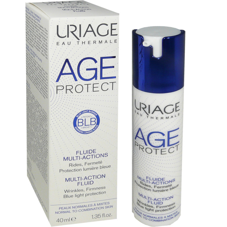 La gamme Age Protect est une innovation URIAGE qui concentre ses produits sur des actifs multi-actions anti-âge et antioxydants dont la BLB brevetée (Barrière Lumière Bleue) pour agir sur la protection de la peau face aux signes de l’âge, les rayons UV, la lumière bleue, la pollution,… Le Fluide Multi-actions Age Protect va estomper les rides et ridules sur le visage, protéger la peau des agressions (pollution, lumière bleue,…), lutter contre l’apparition des rides, taches pigmentaires et la perte de tonicité, resserrer les pores de l’épiderme pour un grain de peau lisse, purifier, matifier, nourrir et hydrater intensément, grâce au BLB issus de l’expertise URIAGE, à l’acide hyaluronique TBPM (Très Bas Poids Moléculaire), au Sang du dragon, aux gommes végétales, au rétinol, aux extraits de fruits de rose, AHA et cellulose. Sa texture fluide et légère laissera la peau très douce, matifiée et délicatement parfumée dès l’application. Jour après jour les rides s’estompent pour retrouver une peau lisse et un visage éclatant. La peau est protégée. Testé sous contrôle dermatologique