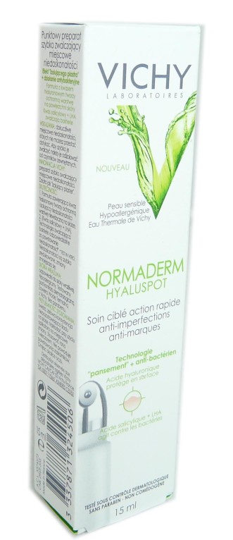 Vichy a conçu une gamme complète de soins pour transformer les peaux à imperfections et lutter contre les boutons, les rougeurs, la brillance et le teint terne. NORMADERM HYALUSPOT facile à utiliser grâce à l’applicateur ergonomique qui délivre de façon ciblée un film protecteur non gras sur l’imperfection, a spécialement été conçu pour éliminer les boutons sans laisser de marque résiduelle. Sa composition associe de l’acide hyaluronique qui forme un film protecteur à la surface du bouton, et de l’Acide salicylique/LHA pour purifier, assécher et éliminer efficacement les imperfections. Adapté aux peaux sensibles, ne pique pas.
