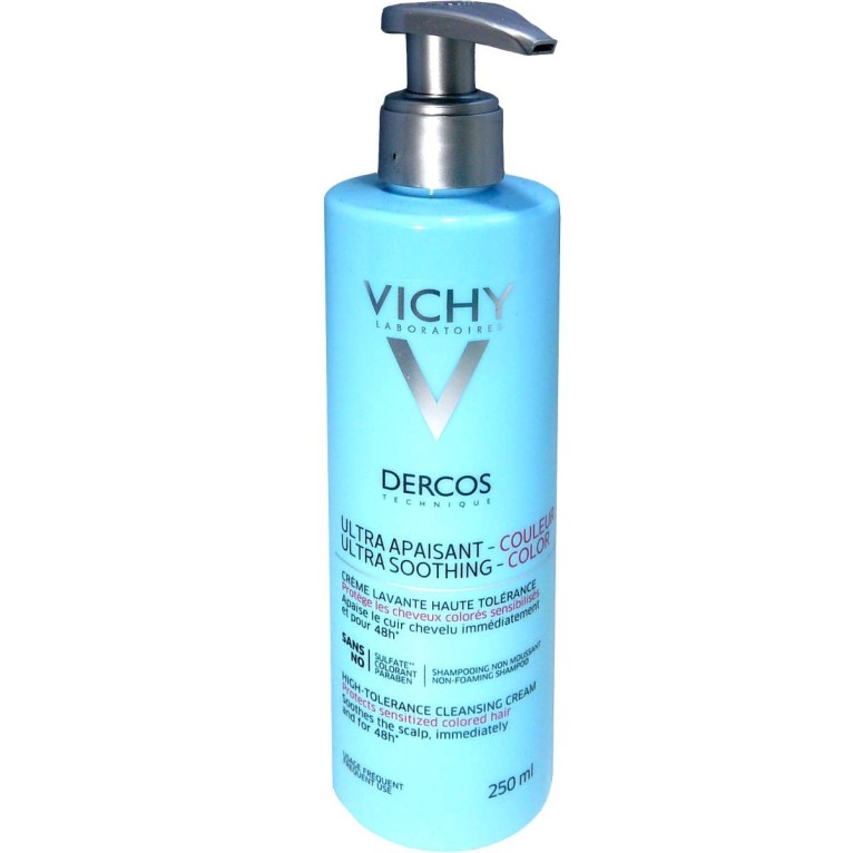 La gamme Dercos de VICHY est composée de soins capillaires pour répondre à tous les besoins des cheveux pour une chevelure toujours sublime. La Crème lavante Ultra-apaisant Couleur Dercos de VICHY composée de Madécassoside, renforce les cheveux pour les protéger au quotidien, apaise le cuir chevelu des inconforts, et redonne souplesse, brillance et douceur à la chevelure. Sa texture délivre une mousse généreuse. Après le shampooing les cheveux sont brillants, très doux et retrouvent toute leur souplesse avec un délicat parfum floral. Le cuir chevelu est apaisé pendant 48 heures. Testé sous contrôle dermatologique. Hypoallergénique Sans sulfate, sans colorant ni paraben