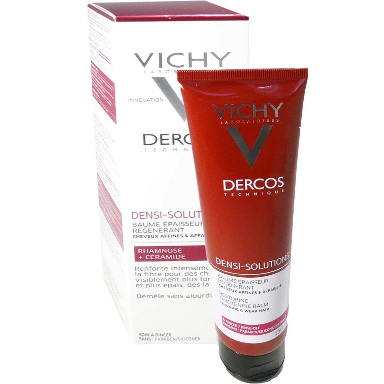 VICHY a conçu une gamme de soins formulés pour améliorer la santé et la beauté des cheveux fins et fatigués, et offrir une réponse ciblée à tous les problèmes capillaires : DERCOS Densi-solutions. Le Baume épaisseur régénérant DERCOS Densi-Solution, est un après-shampooing qui agit dès la racine du cheveu pour redensifier la chevelure en profondeur et ainsi redonner du volume, protéger et régénérer le cheveu et purifier le cuir chevelu grâce à sa formule douce et non agressive même pour les cheveux et cuirs chevelus sensibles. Sa texture gel-crème douce et brillante fond rapidement sur la chevelure pour un soin plaisir. Rapidement, les cheveux sont plus résistants, plus souples et retrouvent de l’épaisseur. Après le soin les cheveux sont doux et brillants. Testé sous contrôle dermatologique sans paraben, sans silicone, sans sulfates, sans colorants