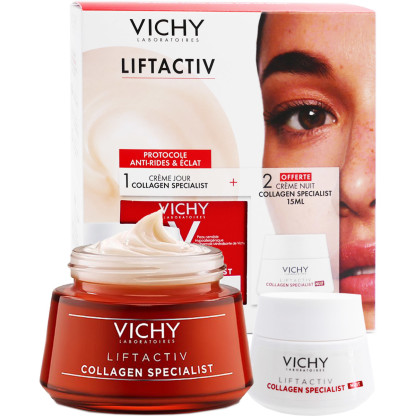 Le coffret LIFTACTIV SPECIALIST Protocole Anti-rides & Eclat discount des Laboratoires VICHY, l’expertise VICHY dans votre parapharmacie en ligne à prix discount, dans 2 soins ciblés pour offrir une action anti-âge global: Liftactiv Collagen Specialist (50ml) + Liftactiv Collagen Specialist Nuit (15ml) offert.