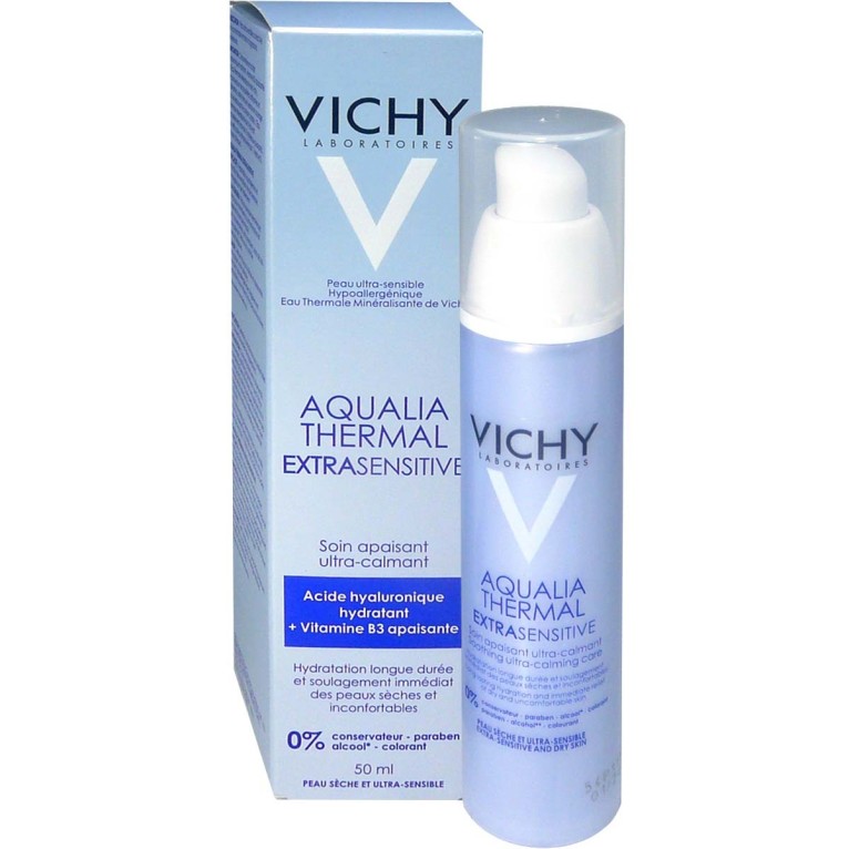 VICHY a conçu une gamme de soins enrichis en eau thermale de Vichy pour offrir aux peaux sensibles toutes les vertus apaisantes et fortifiantes de cette eau de beauté : AQUALIA THERMAL. Extrasensitive Soin apaisant Ultra-calmant est une crème à la texture douce, fraîche, onctueuse et confortable qui pénètre la peau sans effet de gras ni collant, spécialement formulée pour stimuler la circulation d’eau dans toutes les zones du visage et hydrater intensément la peau. Sa composition associe à l’eau thermale de Vichy minéralisante calmante, de l’acide hyaluronique capables de transporter l’eau nécessaire à l’hydratation de la peau, ainsi que de la vitamine B3 qui assurent une fonction apaisante pour diminuer les inconforts, tiraillements et rougeurs. Résultat : la peau est douce et réconfortée, et délicatement parfumée. Testé sous contrôle dermatologique hypoallergénique sans paraben, conservateur, alcool* ni colorant