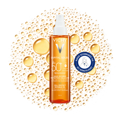 VICHY CAPITAL SOLEIL HUILE INVISIBLE SPF50+ 200ML en vente en ligne sur le site de votre parapharmacie à prix discount. Protégez votre peau des rayons UV avec cette huile solaire invisible de Vichy. Visage, corps, pointe des cheveux
