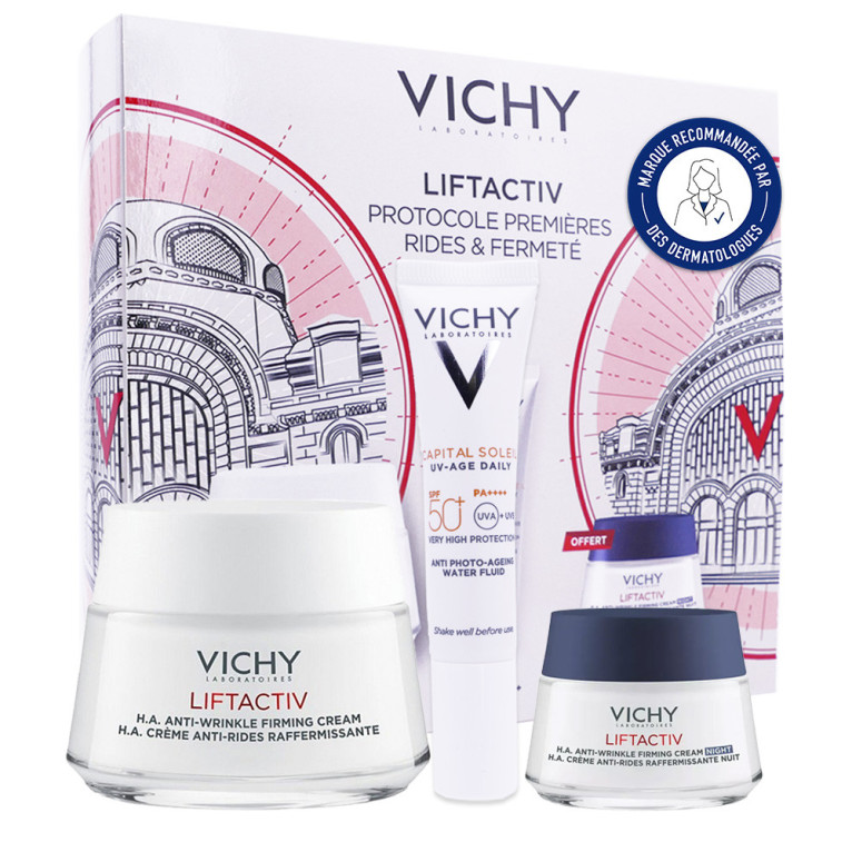 VICHY COFFRET LIFTACTIV "Protocole Premières Rides & Fermeté" : découvrez une routine complète pour lutter contre les premiers signes de l'âge, en vente en ligne sur le site de votre parapharmacie à prix discount. Ce coffret innovant combine des soins de jour et de nuit pour une peau visiblement plus ferme et éclatante