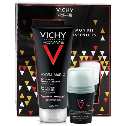 Le coffret « Mon Kit Essentiel » discount de VICHY, 2 produits réunis dans un coffret destinés à prendre soin de la peau des hommes dès le début de la journée ! Déodorant Anti-transpirant Contrôle Extrême 72H Roll-on (50ml) ; Hydra Mag C Gel douche corps et cheveux (200ml). Un coffret à offrir ou à se faire offrir !