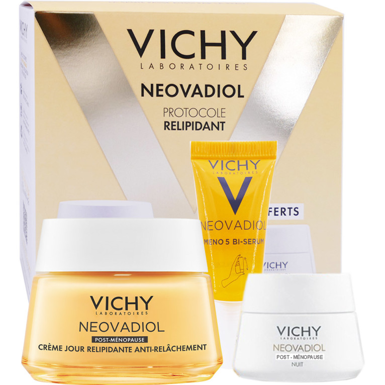 Coffret NEOVADIOL Post-ménopause Protocole Relipidant des Laboratoires VICHY à prix discount, pour les femmes ménopausées, 3 produits: la crème de jour relipidante anti-relâchement (50ml), le Sérum relâchement et tâches (5ml) offert et la crème de nuit relipidante raffermissante (15ml) offerte.