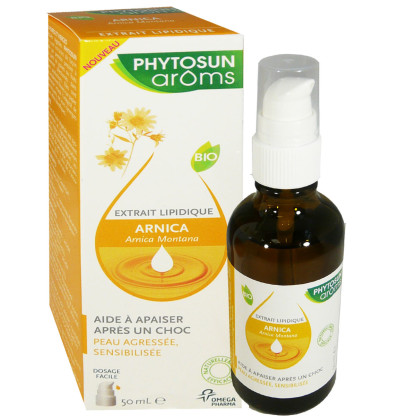 PHYTOSUN AROMS Extrait lipidique Arnica bio à prix discount, l’expertise en aromathérapie dans votre parapharmacie en ligne discount, dans un soin à base d’huiles essentielles de haute qualité indiqué pour soulager les petits bobos du quotidien : bosses, contusions, hématomes… Visage et corps