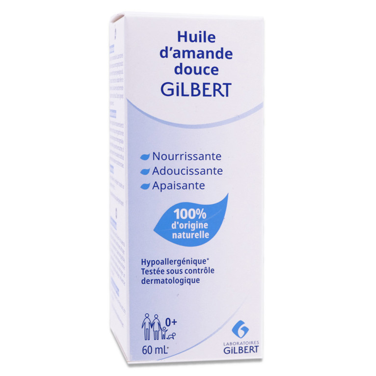 Depuis plus d’un siècle, Les laboratoires GILBERT développent un large choix de produits destiné à la santé et au bien-être de la famille, avec un souci constant d’innovation, de qualité, d’efficacité et de sécurité au meilleur prix pour tous. L’huile d’amande douce GILBERT est une huile vierge 100% naturelle d’amande douce obtenue par première pression à froid, extrêmement riche en acides gras essentiels et qui offre de multiples bienfaits à la peau. Grâce à ses propriétés hydratantes, adoucissantes et protectrices, elle traite les crevasses et les gerçures, elle élimine les croûtes de lait, elle soulage les sensations d’inconfort des peaux sèches : irritations, tiraillements, démangeaisons…, elle atténue les vergetures, elle répare la peau après une exposition solaires et elle peut également être utilisée pour le massage de la peau délicate de bébé.