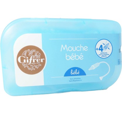 Depuis 1912, le laboratoire GIFRER développe des produits de santé simples et reconnus, gages d’authenticité, de qualité et de tradition pour accompagner la famille au quotidien dans sa quête de bien-être. Le mouche bébé GIFRER est l’allié incontournable des parents pour soulager bébé de façon sereine lorsque son nez est encombré. Les embouts jetables du mouche bébé de forme anatomique sont conçus pour s’adapter parfaitement au mouche-bébé. Chaque embout à usage unique garant d’une hygiène optimale, est doté d’un filtre en mousse absorbant extra-souple pour retenir le mucus de bébé. Pratique par son étui, il permet d’emporter partout avec soi le mouche bébé et ses embouts pour le garder toujours propre.