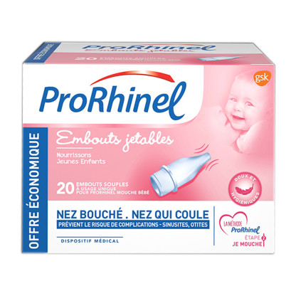Les embouts jetables ProRhinel de NOVARTIS, les embouts pratiques, hygiéniques et adaptables au mouche bébé ProRhinel pour moucher Bébé et libérer son nez en douceur.