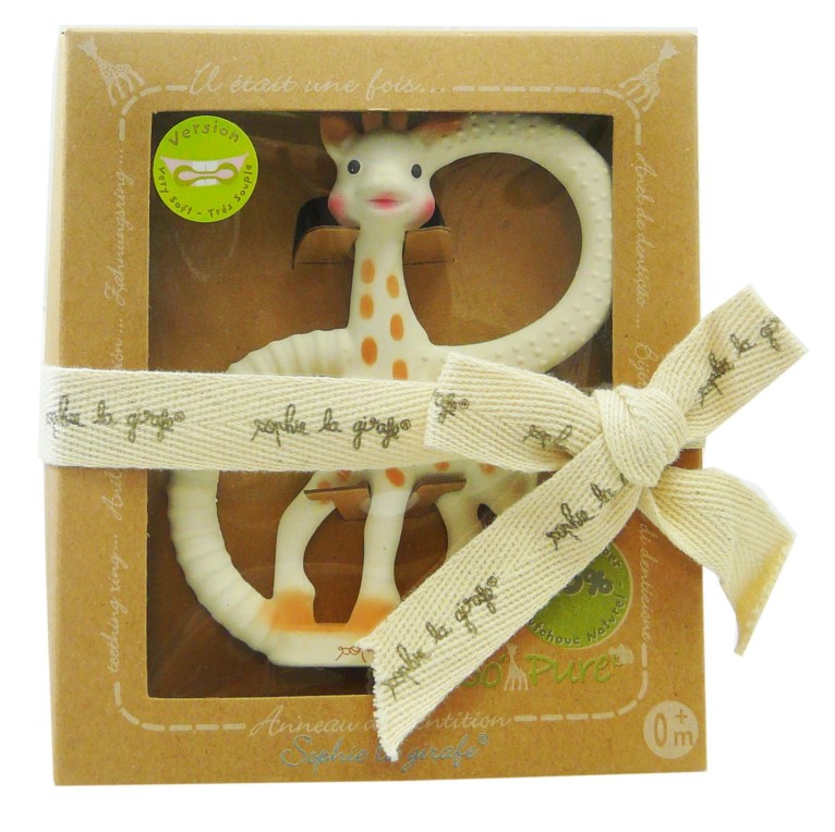 Depuis 1961, Sophie la girafe est devenue une figure emblématique du jouet made in France, plébiscitée par les mamans et leurs enfants ! Les bébés ont désormais leur propre Sophie pour soulager les percées dentaires grâce à ce jouet de dentition en caoutchouc 100% naturel, spécialement conçu pour être mordillé en toute sécurité. Sa composition totalement naturelle, ses textures variées constituées de picots et de stries et sa forme en 2 anneaux parfaitement adaptée à la bouche du nourrisson en font un jouet premier-âge idéal pour soulager bébé.